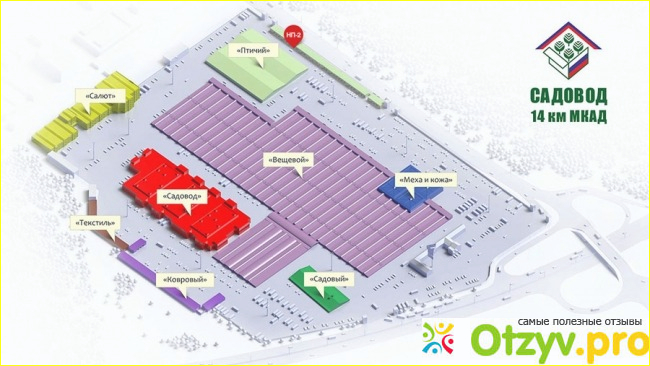Территория рынка условно разделена на восемь частей, каждая имеет название: из названий следует, что продается в том или ином отделении: Итак:1) Салют. 2)Птичий рынок. 3) Вещевой-это самый главный из всех. 4) Ковровый рынок. 5)Текстиль. 6) Рынок "Меха и кожи".7) Садовый-который , теоретически , должен быть первым, но увы. 8) И наконец "Садовод", из-за которого, собственно , все рынки и собрались.