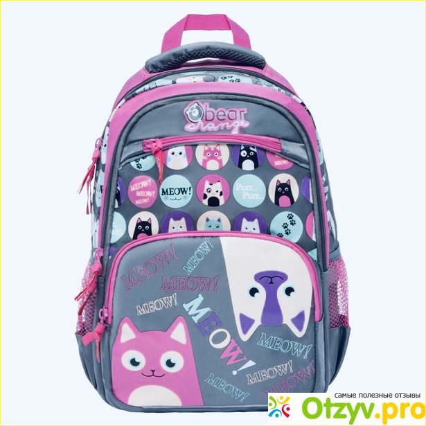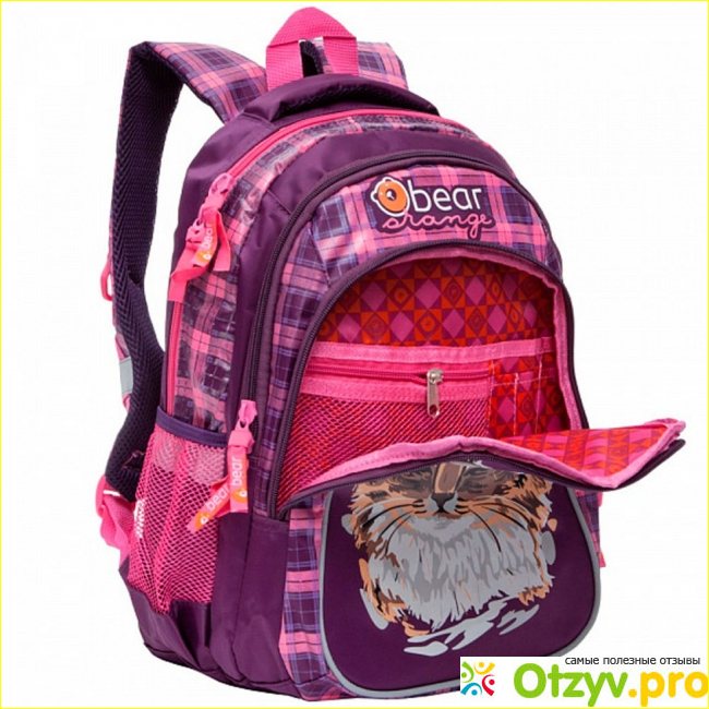 Модель Orange Bear V-52 называется Кошка. И это не случайно, ведь спереди практически во весь план рюкзака напечатана милая и довольно симпатичная кошечка. Правда там она представлена не во весь план, а только ее мордочка. Сам рюкзак удобен для детей тем, что он закрывается на молнию. Поэтому с ним справится даже первоклассник.
