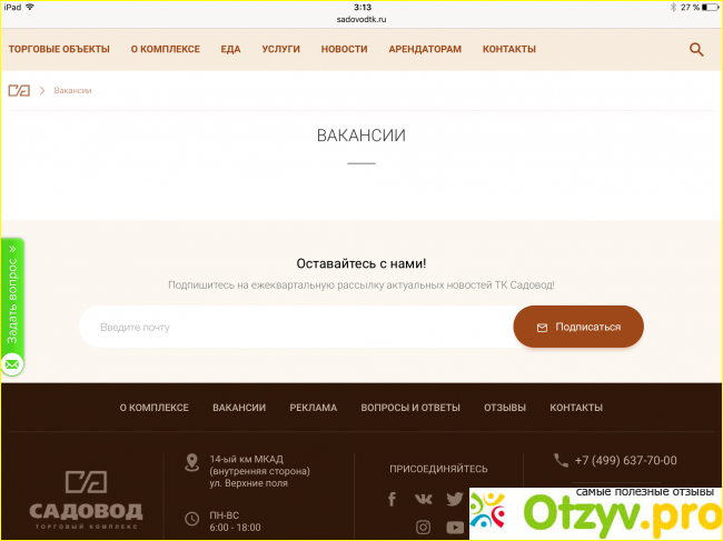 В торговом комплексе Садовод очень часто открываются разнообразные вакансии, поэтому если вы находитесь в поисках работы, то на официальном сайте вы можете посмотреть актуальные вакансии, созвониться с менеджером по телефону или подать свое резюме онлайн и пройти собеседование. В случае положительного решения вы будете приняты в штат сотрудников.