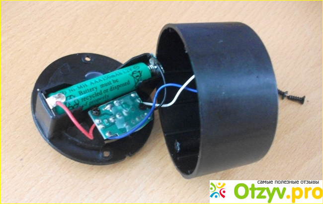 Такая малая ёмкость выбрана по двум соображениям: аккумулятор большей ёмкости не будет успевать заряжаться существенно, и его ёмкость не будет использоваться полностью, что еще усугубит и эффект памяти, присущего им. И второе: аккумуляторы меньшей ёмкости "дольше живут", чем их более мощные собратья, выдерживая большее число циклов заряд - разряд. Для отключения при хранении служит выключатель, добраться к которому можно повернув против часовой стрелки и сняв верхнюю часть светильника.