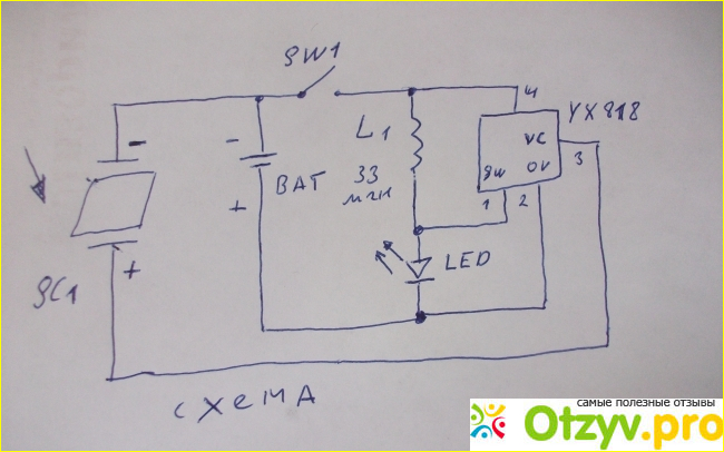 Если нужно вынуть её, сначала снимите аккумулятор, он будет мешать заправить на место светодиод. Деталей на плате всего четыре: выключатель, микросхема, (YX8018), дроссель на 33 микрогенри (выглядит, как резистор, но это однослойная катушка, намотанная на ферромагитный сердечник) и светодиод белого свечения.