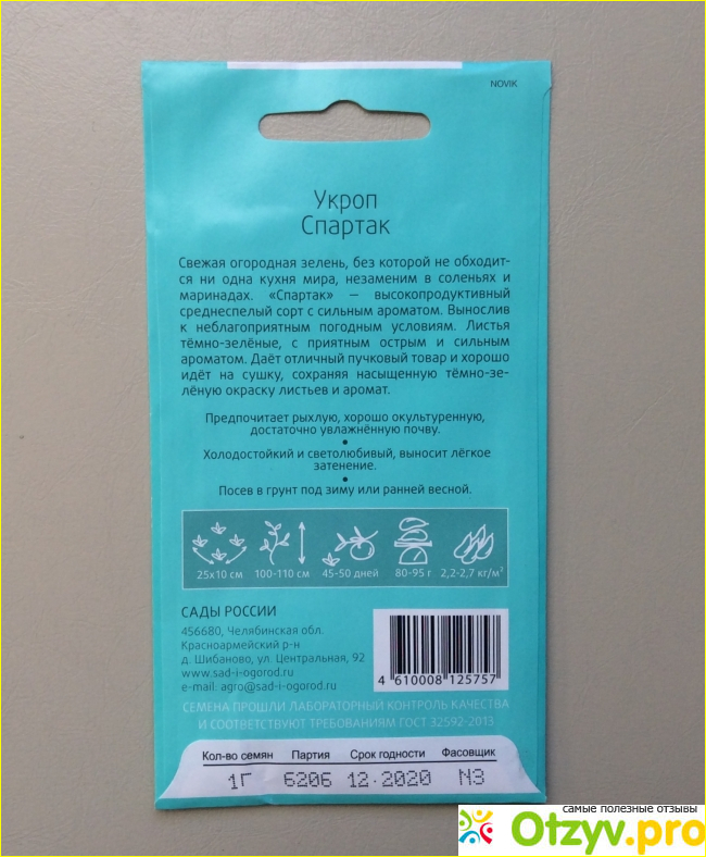 Перевернув упаковку можно ознакомиться с адресом производителя, номером партии, сортом семян, сроком годности, всеми характеристиками растения при его посадке, росте и развитии. Помимо этого можно знакомиться с со всеми необходимыми данными об укропе: ароматом, правильным цветом взрослого растения, его скороспелостью и многим другим. Для того, чтобы растение выросло качественным и хорошим производитель оставляет дополнительную информацию о необходимой для культуры почвы, также напоминает, что укроп является холодостойкой и светолюбивой культурой и предлагает правильный период года для высадки в открытый грунт.