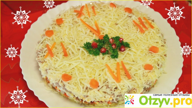 Первый слой отварная картошка, далее куриная грудка, грибы, натертые яйца, морковь и сыр. Каждый слой смазываем майонезом а сверху украшаем ввиде новогодних часов как на фото.