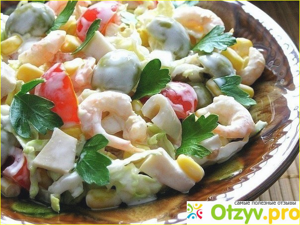 Салат с креветками, кальмарами, оливками и кукурузой |