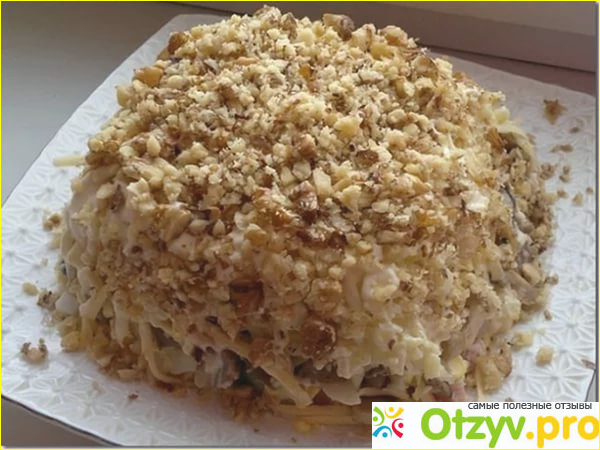 По вкусу бросаем соль, перец, майонез, смешиваем и украшаем орехами.
