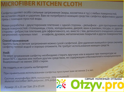 Материал салфетки двусторонний с разным плетением, что позволяет применять ее для разных целей: убрать пыль или оттереть грязь, намочив ее простой водой без всяких моющих средств и хорошо отжав, чтобы вода не текла.