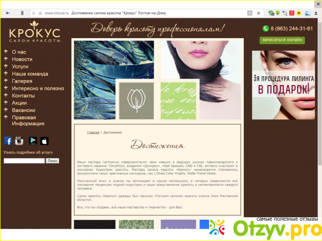 Долго искала для себя идеальный салон красоты, чтобы по ценам все было не слишком дорого и так же нормальное качество работы и я его нашла. Это салон "Крокус", он работает у нас в Ростове, уже не первый год туда хожу, очень нравится обращение к клиентам и то, что они осуществляют всегда индивидуальный подход. Нравится здесь энзимный пилинг, очень хорошие маски для лица здесь делают, красиво красят.