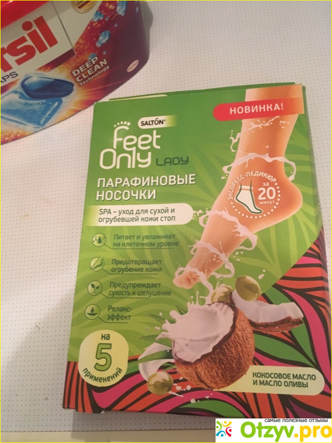 Мы достали их из пакета, и поместили в теплую воду, чтобы парафин расплавился. Ждали где-то минут 5. Потом достали их из воды и аккуратно открыли носочки, отрезав часть по пунктирной линии. Далее засунули ноги в носочки и закрепили сверху лентами, чтобы парафин кое-где не вытек. Сиделитак и расслаблялись минут 20. Ощущение просто нереальные!) По истечении времени достали ноги из парафина, а остатки втерли в ножки. После процедуры сразу заметен эффект! Ножки стали мягике-мягкие! Носочки питают и увлажняют на клеточном уровне за счет теплого парафина. В парафине содержатся масла кокоса и оливы, которые предохранят от обезвоживания, сухости и шелушения! Так же есть большой плюс-они многоразовые! 1 пара аж на 5 применений, это можно 5 раз организовывать себе домашний спа салон и наслаждаться приятными ощущениями! Мы с подругой просто нереально довольны покупкой, после процедуры ножки просто прелесть! Могу уверенно рекомендовать тем, у кого сухая и огрубевшая кожа стоп, вам носочки должны помочь)