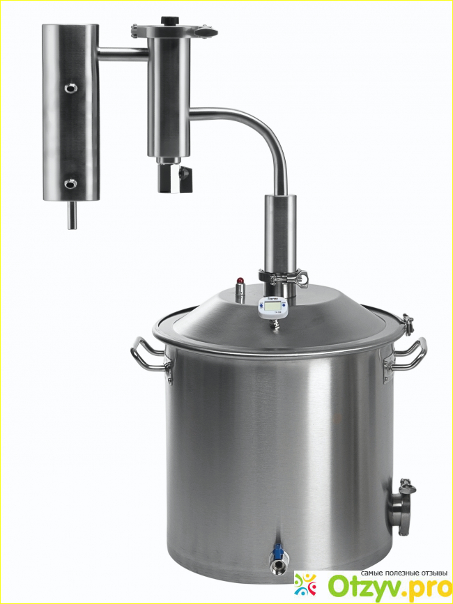 Возможности модернизации так же имеются. В частности аппарат в своей базовой комплектации оснащается сразу тремя клампами на 38мм. Первый кламп размещен на сухопарнике. Что касается второго, то он размещен в нижней части бака. Такое расположение не случайно. Сюда при желании можно установить ТЭН. Третий кламп установлен в головной части самогонного аппарата. Здесь можно установить множество самых разных устройств начиная от царги и заканчивая диоптром.