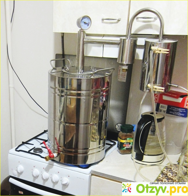 Аппарат я выбрал такой, чтобы его можно было легко и непринуждённо поднимать без помощников, чтобы ставить на газовую плиту, а потом относить в ванную на промывку. Но и не слишком маленький, чтобы можно было перерабатывать большой объём. В итоге понравилась тридцатилитровая модель с одним сухопарником. Эта деталь нужна для отбора сивушных масел до того, как они попадут в камеру охлаждения. Мне пришлось позже купить кран и прикрутить его к сухопарнику, чтобы можно было сливать вредную жидкость прямо во время процесса. Если этого не делать, то сухопарник может даже переполниться. А так качество гарантировано.