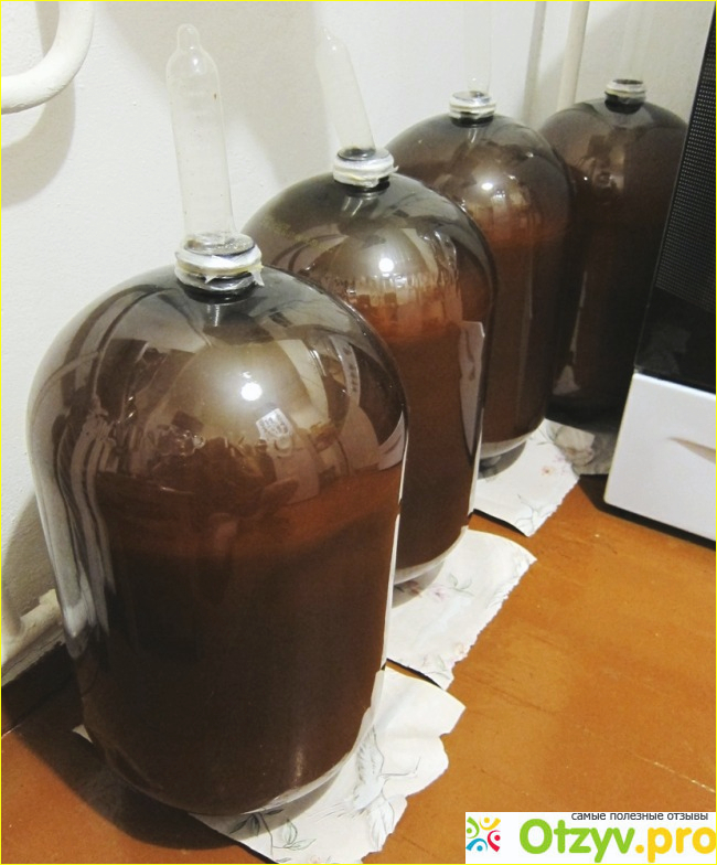 Переработанные яблочки были пропущены через мясорубку и равномерно распределены между тридцатилитровыми бутылями, залиты водой, закрыты гидрозатворами в виде обыкновенных презервативов и оставлены бродить. Чтобы процесс немного ускорить, я накрошил в каждую бутыль по пачке дрожжей (можно купить в супермаркете Пятёрочка).