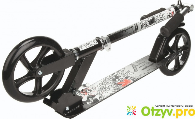 Колеса у него большие, в диаметре они 230 мм и сделаны с полиуретана, самокат устойчивый и на нем легко научится держать равновесие, хоть он и предназначен для прогулок для взрослых и деток, он не такой уж и большой, его размер 72x24x11 см (это в сложенном виде), это еще один его плюс, то что его легко можно сложить и брать с собой на прогулки и если нужно сесть в транспорт, то этот самокат не займет много места.