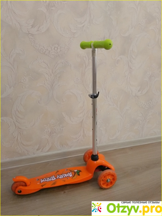 Ручки с резиновыми накладками, колёса большие и так-же прорезинены. Сама платформа имеет шероховатый слой и обувь по ней не скользит. Площадь платформы большая и малышу удобно стоять на ней обеими ногами. Рама железная и сварные швы очень качественные. Ручка регулируется по высоте.