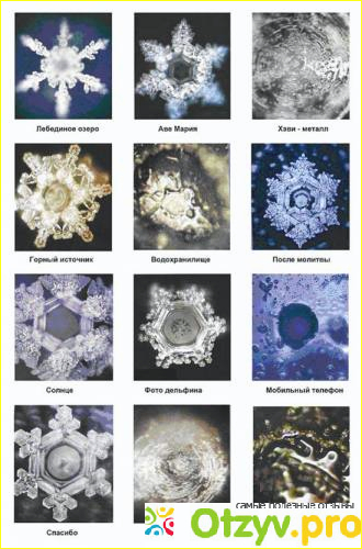 ... Будто бы подразумевается то, что вот, дескать, человек выложил из пачки в 48 штук несколько фотографий различных кристаллов воды, сделанных под микроскопом... Там показаны, мол, кристаллы, которые создаёт матушка природа, когда человек произносит те или иные слова или фразы...