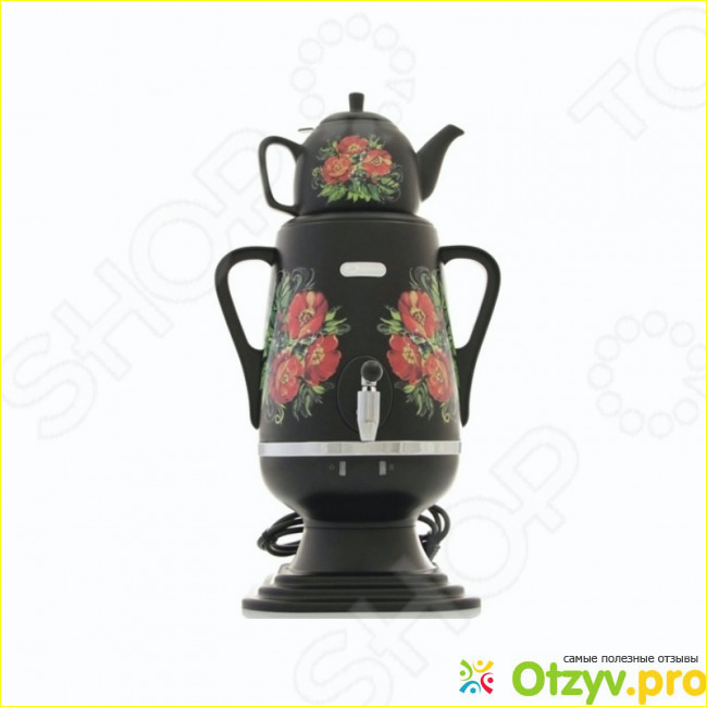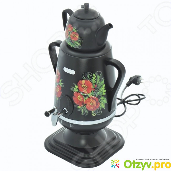 Весит такой аппарат приблизительно 3000 г, габариты составляют 290x490x225 мм. Инструмент сам по себе тяжелый, с ним просто так не походишь по улицам. Продается в черных и белых оттенках с различными расцветками (птицы, маки, колокольчики). Я купила самовар черного цвета с маковой расцветкой, потому что темные вещи реже пачкаются, а за более светлыми приходится постоянно ухаживать. Такой дизайн шикарно смотрится рядом с различными приборами на кухне и гармонично сочетается с элементами интерьера.
