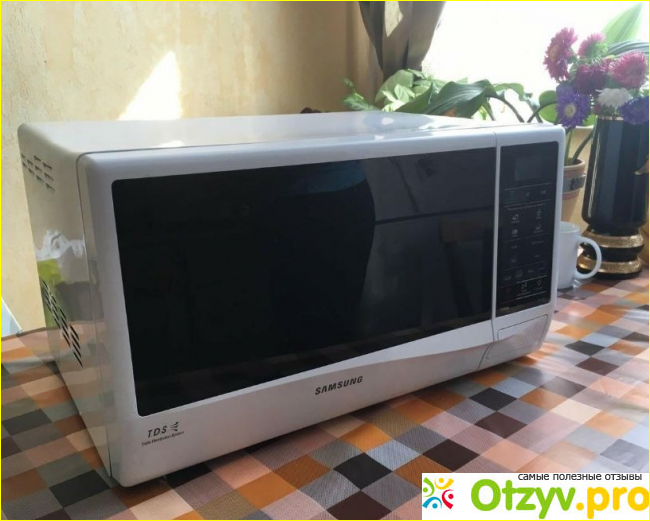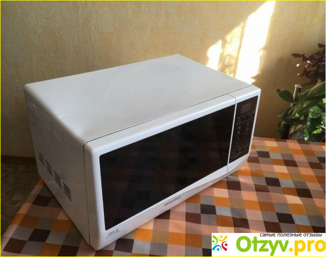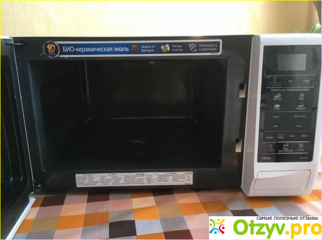 Как мне рассказывали родители, в советские времена практически не было таких устройств семьях и соответственно на кухнях. Всё разогревали только на печке, либо в электрической или газовой духовке. Массово микроволновки начали появляться только во второй половине 90-х годов прошлого века. Сама я практически не помню тех времен, когда такого прибора у нас на кухне не было. Теперь я совершенно не представляю, как можно было обходиться без него!? Разогреть заранее приготовленный обед, разморозить продукты или приготовить что-нибудь на быструю руку — без микроволновки такое уже не сделаешь. Греть же на плитке сплошная морока и занимает гораздо больше времени. Так получилось, что у нас в семье всегда были микроволновки компании LG и последняя трудилась в нашей семье без всякого ремонта уже 15 лет! Как я читала это очень хороший показатель для такого устройства. Но ничего не бывает вечным, и в конце концов что-то там случилось с магнетроном, так что долгожительнице-микроволновке пришёл конец. Поэтому, когда год назад она сломалась, то решили подобрать ей замену. Прежняя микроволновка была с грилем поэтому и новую выбирали такую же. Многие считают в микроволновой печи гриль ненужным элементом, но я с ними не согласна. В комбинированном режиме можно приготовить не просто быструю и полезную курочку, но и легко добиться того, чтоб она была с красивой поджаренной корочкой. Такого никогда не добьёшься в обычной микроволновке, а в печке это занимает гораздо больше времени. Чтобы приготовить небольшую курочку с корочкой в обычной духовке, понадобится около часа, а в микроволновой печи это можно сделать за 20-25 минут. Вполне возможно приготовить и раньше, всё зависит от того насколько крупный кусок куриного мяса вы готовите. Например, на запекание 2 куриных ножек, чтобы они получились с корочкой, уходит минут 15-20. Так что скорость приготовления, самое большое достоинство таких печей. В конечном итоге выбрали микроволновую печку белого цвета Samsung модели GE732KR. Так сказать, решили отойти от традиции, и захотелось попробовать на деле, что такое био-керамическое покрытие, о котором были наслышаны в рекламе. Было обещано, что оно очень устойчивое к царапинам и по этому показателю гораздо лучше, чем отделка внутренностей печи нержавеющей сталью. По рекламе выходило, что такая эмаль гораздо лучше чистится от остатков жира и капель. А это действительно проблема, особенно если часто применяешь гриль. При интенсивном тепловом воздействии грилем, жир начинает немного обрызгивать стенки и постепенно сильно загрязняет внутренности микроволновки. В принципе, с помощью современных моющих средств и нержавейка неплохо чистится, но определенное воздействие и следы на ней всё-таки со временем остаются. К тому же эта микроволновка внутри с антибактериальным эффектом и предотвращает распространению бактерий и микробов внутри неё.