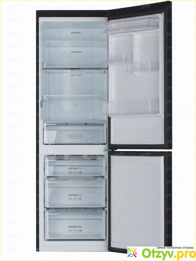 Первым делом стоит отметить яркий внешний вид, черного цвета холодильник, качественная сборка. Корпус металлический, а внутренняя часть изготовлена из пластика, который между прочим стойкий ко впитыванию запахов, однажды мы забыли включить функцию отпуск, в результате чего часть наших продуктов пропала, но когда вернулись с отдыха заметили, что никакой вонищи в холодильнике не было. Морозильная камера в данной модели располагается снизу, что очень удобно. Кроме этого она довольно вместительная, ее объем составляет 98 литров, там предусмотрены выдвижные ящики, но вот производство льда не предусмотрено, но контейнер мы сняли с предыдущей техники. Размораживается морозильная камера по системе No frost.