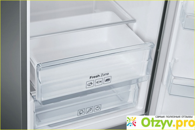 Еще одно не существенное замечание относящиеся к данной модели холодильника так это то, что похоже на то, что в холодильнике перепутано размещение так называемой зоны свежести (предназначена для хранения мяса и рыбы), это выдвижной ящик который находится с верху от ящика для овощей. Не знаю может я не права, но у меня создалось впечатление, что хранить мясо лучше в нижнем ящике, а овощи в верхнем. Так еще один плюс этой модели - это очень удобные боковые контейнеры, их просто можно размещать так как вам удобно. Еще здесь есть выдвижная полка, за счет наличия которой стало очень легко размещать большие и высокие емкости с продуктами.