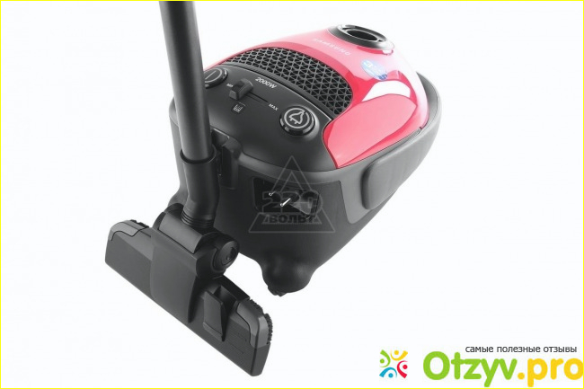 Внешний вид довольно приятный у пылесоса, он светло красного цвета. на корпусе имеется собственно кнопка включения, кнопка автоматического сматывания шнура, а также очень удобная регулировка мощности при помощи ползунка, выставляете его на нужный вам уровень. Я лично ставлю всегда на максимум, так поступает и знакомый, у него высокошерстный ковролин, который требует более тщательной уборки и только на максимальной мощности можно добиться солидного всасывания. Весит пылесос чуть больше 7 килограмм, очень удобен при транспортировке из одной комнаты в другую за счет колесиков удачных.
