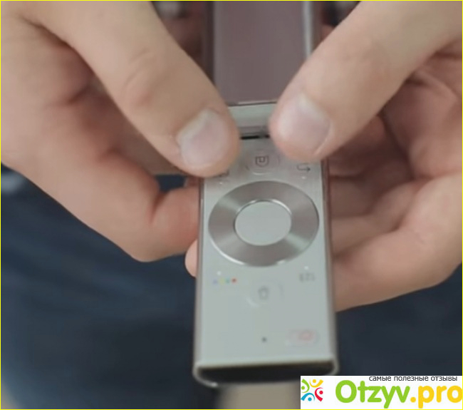 С верхней панели пульта можно увидеть круг и всего несколько кнопок. Кстати пульт действует не через ИК-порт, как это обычно бывает у простых телевизоров, а через блютуз. Чтобы включить или выключить его, нужно нажать две кнопки - вперед и назад. И задержать так на несколько секунд.