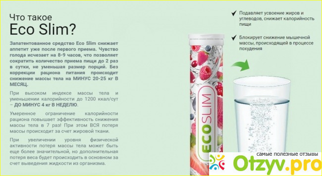 Эко Слим являются действительно эффективными таблетками, которые работают на снижение веса, не зацепая работы внутренних органов человека. Эти таблетки основаны на натуральных компонентах, поэтому они не вредят организму. Каждый компонент в составе средства натуральный, он действует безопасно. Эко Слим - это шипучие таблетки, которые растворяются в воде, образуют очень вкусную минеральную воду, которую стоит принимать регулярно. Именно регулярный прием средства, гарантируют быстрое снижение веса. Производитель обещает, что средство помогает устранить более 15 килограммов за тридцать дней, что является достаточно весомым показателем.