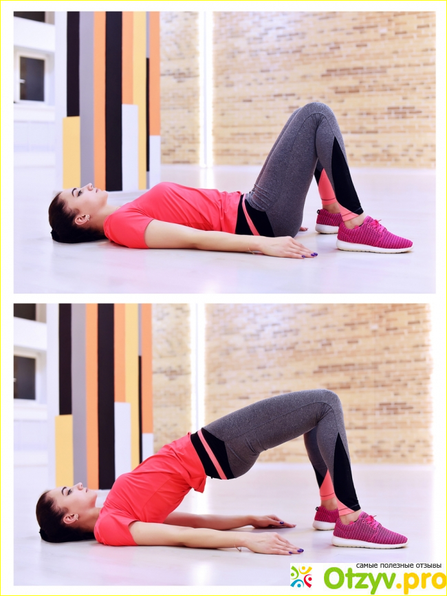 Для следующего упражнения надо лечь на спину, ноги снимаем в коленях. Поднимаем таз наверх, задерживаемся, потом в исходное положение.