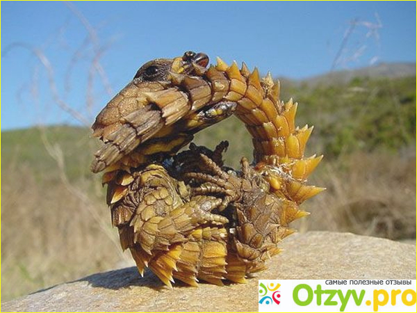 Ящерица, родом из Африки. Она живет обычно в каменистых районах, но иногда встречается и в южных областях Сахары. Визуально поясохвост выглядит очень устращающе: все тело покрыто плотными пластинами, между которых находятся острые шипы. Максимальных размер существа - 70 сантиметров. Эти животные не склонны нападать, а вот обороняются они очень занимательно. Если особь крупная, то она раздувается, отпугивая своим внешним видом. Мелкие же поясохвосты сворачиваются кольцом и кусают себя за хвост, челюсти у них сильные, развернуть такое живое кольцо невозможно, пока сам зверек того не пожелает.