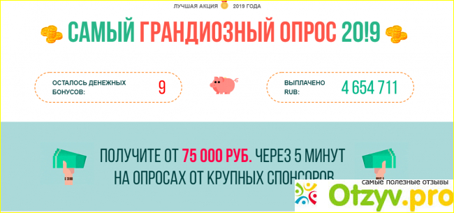 Сайт самый обычный, не вызывает никаких подозрений. Много отзывов, опросов. На самом первом экране указано, сколько еще человек могут пройти опрос за деньги и сколько вообще можно получить. А также сколько выплачено людям, ответившим на анкеты.