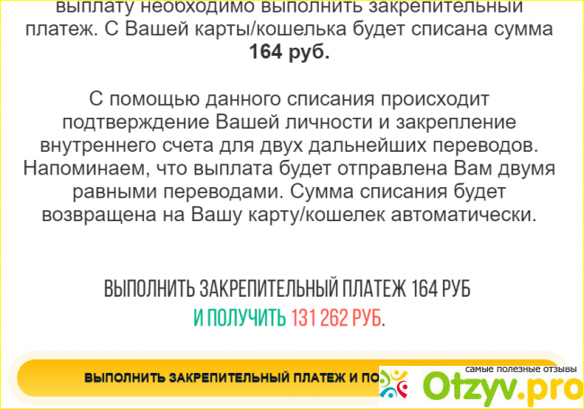 Весь грандиозный масштаб завершается мизерным разводом. Чтобы получить платеж нужно заплатить всего 164 рубля, которые позволят верифицировать вас и затем перевести деньги. Понятно, что верификация нужна для платежных систем, когда вы указываете имя, фамилию. Чтобы подтвердить необходимы данные паспорта. Здесь верификация ни к чему. Поскольку никаких данных изначально не вводится.