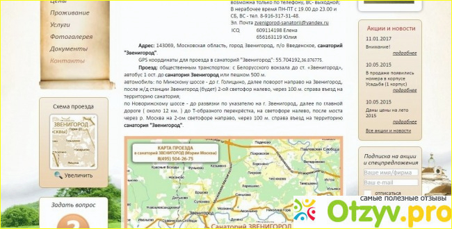Раздел «Контакты»Здесь не только телефоны и адрес санатория, но и подробное описание, как добраться до него. Плюсом – карта проезда. Вы можете приехать на личном автомобиле, есть стоянка.