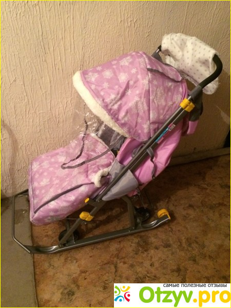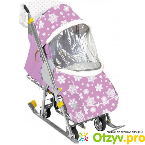 Санки изготовлены из плотной ткани, которая имеет водоотталкивающие и ветронепроницаемые эффекты. Санки имеют красивый и стильный дизайн, отличным украшением является опушка меховая, которая есть на козырьке и на чехле для ножек.