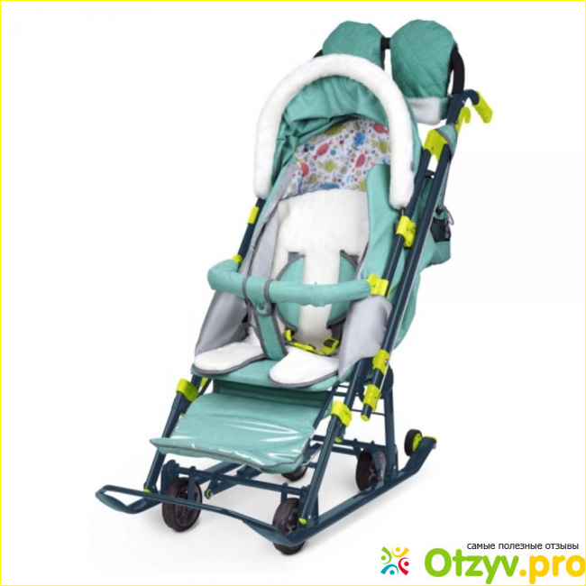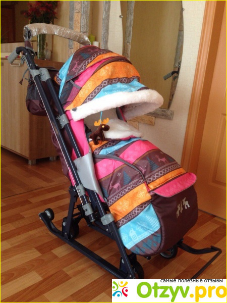 В санках 5 точечные ремни, меховое сиденье, козырек полностью закрывается, есть окошко смотровое, варежки для мамы, ручка перекидная, три положения спинки. В общем, та же коляска, мне удобно, детеныш мелкий еще 8 месяцев, поэтому мне важно было чтоб от коляски не отличалось. Для более взрослого взяла бы попроще. Единственное, из недостатков, очень низко ручка, болит спина. И покрытие с полозьев слезло. Только когда на колёсах везёшь звук такой как будто телегу тащишь. Это лучшие санки из всех, представленных на рынке.