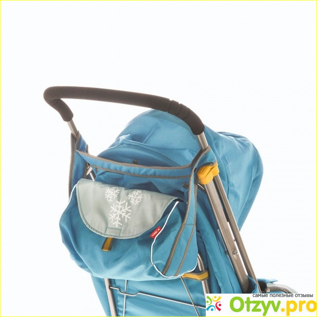 Есть и санок маленькая, но вместительная сумка для мамы ребенка, для разных мелочей, таких как кошелек, платок, перчатки, ключи от квартиры, помада, расческа и можно в нее убрать бутылочку с соком или чаем для ребенка. Сумка крепится на клепках к металлическому основанию ручки санок.