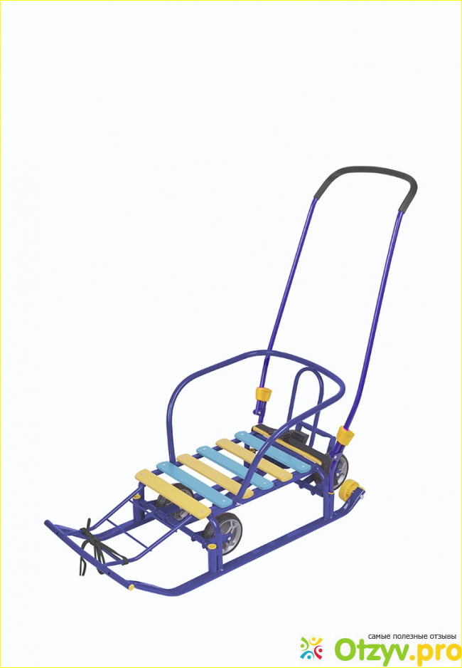 В продаже сани встречаются в разных цветах. Чаще всего они бывают синего, красного, зеленого или голубого цвета. У этой модели идет перекидная ручка. Ее можно установить спереди или сзади саней. Ручка вставляется не совсем легко, для этого нужно приложить усилия. Поэтому перекидывать ее постоянно будет не удобно. Лучше сразу выбрать одно подходящее положение. У этого транспорта идет одно посадочное место. Благодаря тому, что у них идет высокая спинка с подлокотниками ребенку удобно сидеть и он не сползает при езде.