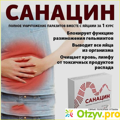 После одного курса лечения Санацин прекрасно очищает организм от глистов-вредителей и продуктов жизнедеятельности паразитов. Он также восстанавливает микрофлору кишечника, что предотвращает повторное заражение и обеспечивает надежную защиту организма.