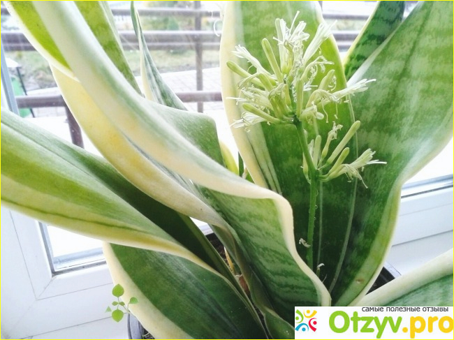 У меня дома сансевьера не цвела ни разу, хотя выросла очень большой и красивой, зато на работе два года назад у нас это растение цвело очень интересными белыми цветочками на длинном цветоносе.