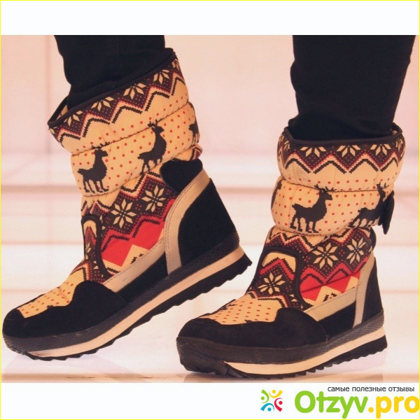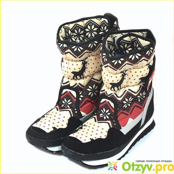 Мне понравилось, что гни не имеют какого-либо ярко-выраженного цвета: в них присутствует и черный цвет, и белый, и бежевый и даже красный. Много цветов, а значит внешний вид у сапог будет ярким, модным, да и подойдут они к пуховику любого цвета.