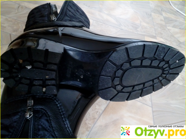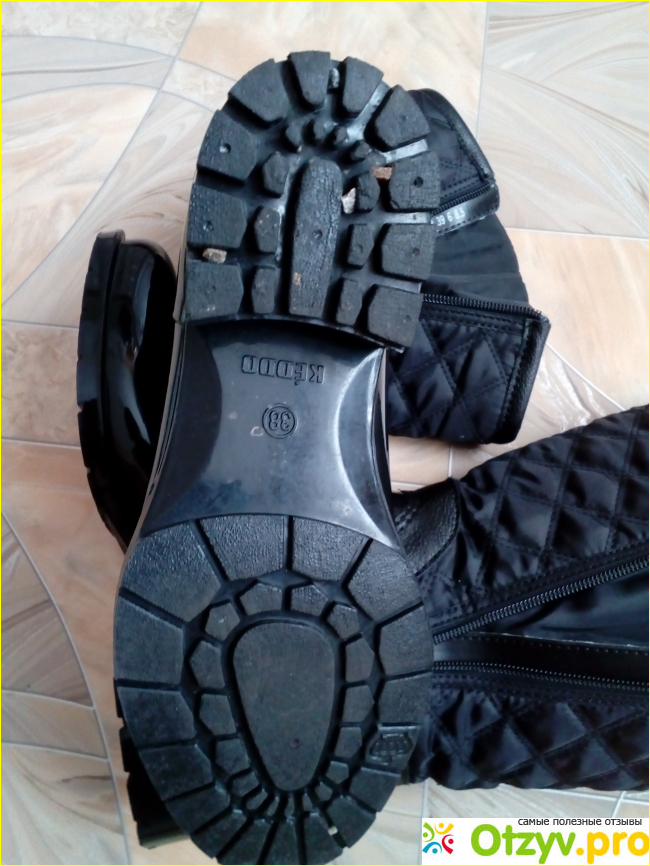 Удобная толстая подошва с неглубоким протектором и невысокий широкий каблук придают сапогам устойчивость. Колодка достаточна удобна, позволяет свободно передвигаться по мокрому снегу. Кстати, протекторный рисунок не только на подошве, но и на каблуке, что дополнительно увеличивает сцепляющее свойство с поверхностью.