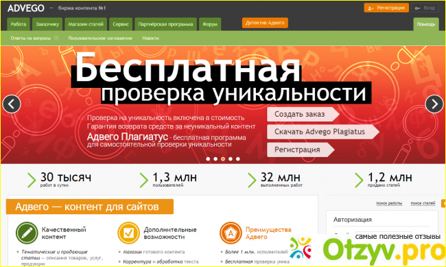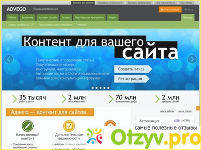 Сайт Адвего для тех, кто желает попробовать свои силы на поле копирайта. На сайте две группы пользователей. Одна - заказчик, другая - исполнитель. Задания на сайте разные и зависимо от задания и оплата. Самые дорогие заказы - написание статей. Самые простые и недорогие - написание комментариев. Если указывается уникальность, то комментарий может быть оценен немного дороже.