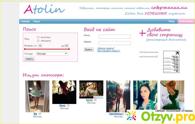 Ладно, к чему я, собственно, веду. Совсем недавно наткнулась на один специфический сайт знакомств — Атолин. ру. Нет, с первого взгляда он ничем не отличается от всех других подобных сервисов. Для того, чтобы познакомиться, надо зарегистрироваться, завести свою анкету, добавить фото и ждать отклика или же писать самостоятельно понравившемуся вам человеку. Вот только все девушки, регистрирующиеся на сайте Атолин. ру прямо так и отнесены на этом сайте в категорию «Содержанки», которые ищут своего спонсора. Мужчины же, зарегистрировавшись на этом сайте, попадают в категорию «Спонсоры», ищущие себе идеальную девушку.