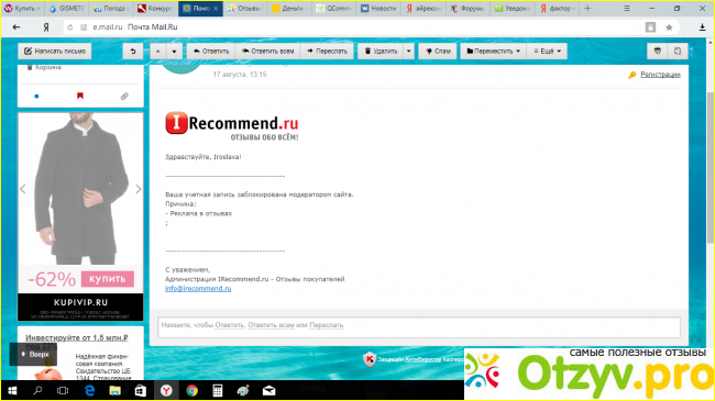 Но это еще не все. В один совсем не прекрасный день айрик меня просто тупо забанил. Мне пришло письмо на электронную почту, что мой аккаунт заблокирован, якобы у меня содержится реклама в отзывах. Но я там писала в основном про косметику, детских товарах и о моих путешествиях какая там реклама? Правда, в последнее время написала несколько отзывов про интернет-магазины и своем опыте покупок там, вот это-то наверное и не понравилось грозным модераторам. Еще у меня есть подозрения, что заблокировали меня потому, что стали хорошие просмотры отзывов, так как написала несколько рейтинговых отзывов. Сайт тупо не захотел платить и заблокировал меня как неугодного им пользователя. Вот так пишешь-пишешь, а тут бац и блокировка.