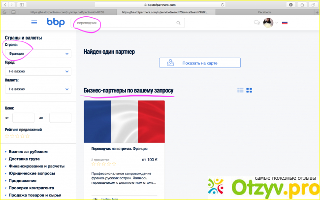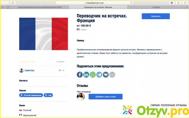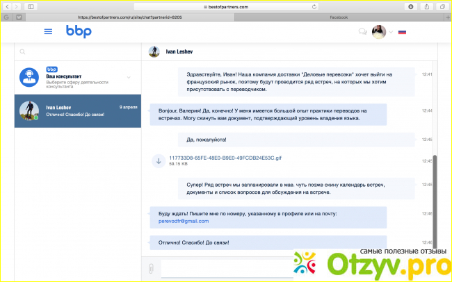 Наша компания из России, мы боялись, что для выхода за рубеж (транспортные перевозки) мы проведем большое количество переговоров и заплатим немалые деньги за услуги переводчика. Покопавшись в анкетах переводчиков на сайте, я выбрала кандидатов, которым написала. Ответили мне не сразу, даже не через пару часов. Но ответили. В последствии договорилась с одним, так как другой на нужные даты был занят. Так вот сделка прошла успешно, с отличной работой переводчика Ивана, которую я нашла на сайте. Переводчик проживает в стране, где проходила сделка, это удобно. Избежали трат на билеты, проживание и т. д. Встретились в кафе, обсудили нашу позицию, показали документы. Ну и около часа сопровождения самой сделки. Так что очень советую сайт bestofpartners для поиска услуг и товаров за рубежом и в России. Для молодого сайта все вполне не плохо, тем более в России должны существовать такие площадки.