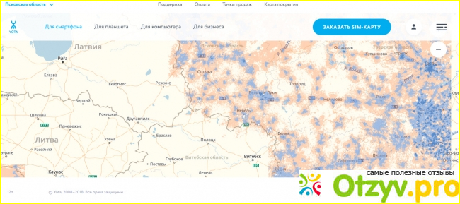 Карта покрытия - раздел, где отображена карта с зонами охвата оператором тех или иных территорий. В поисковой строке необходимо вбить свой регион. Цветовая индикация отобразит, что именно Йота технически предоставляет в том или ином районе - 2G, 3G или 4G.