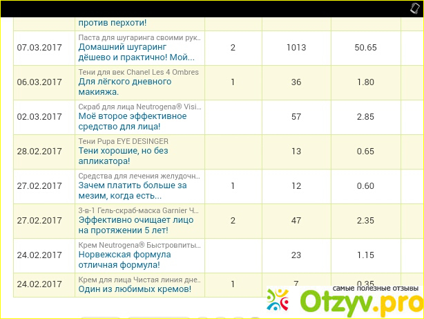 2. Больше всего зарабатывают те, кто первый создает отзыв о новом продукте. Всегда лучше писать такие отзывы, в категории которых меньше отзывов, чем к примеру о помаде, о которой уже есть 200 отзывов, соответственно там отзыв затеряется и не будет читабельным.