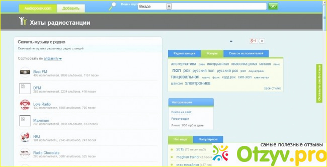 Единственный минус сайта это ограничение в 50 песен для незарегистрированных пользователей. Я хоть и зарегистрирован на сайте, но уже давненько не заходил в свой аккаунт, так как меня все устраивает и в ограниченной версии. Вообще, регистрироваться на сайте советую только тем, кто часто слушает музыку непосредственно на сайте. Я же предпочитаю музыку с сайта качать себе на компьютер, хотя иногда люблю и послушать напрямую. Также хочу отметить очень удобный поиск на сайте, это большая редкость на современных сайтах, так как именно на функциональности поиска по сайту разработчики почему-то любят немного схалтурить. Здесь же можно ввести часть названия и в результатах обязательно высветится та песня или тот производитель, которую Вы ищете.