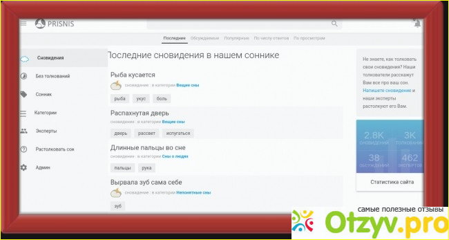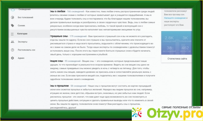 Что это за сайт? Это сайт по толкованию ваших снов. Вы можете как сами писать свои сны и ждать его толкование, так и сами помочь растолковать чей-то сон. На сайте есть категории снов, в которые вы можете найти что-то для себя, то что вас интересует.