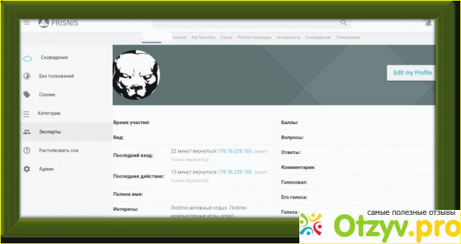 На этом сайте вы просто можете рассказать, что вам приснилось и получить толкование вашего сна.Что для этого нужно? Все очень просто. Вы просто заходите на сайт, создаёте там свой профиль, можете поставить в своём профиле какой вам нравится аватар, написать о своих увлечениях. Профиль служит для того, чтобы в нём вы смогли просматривать свои вопросы, свои ответы. Смотреть сколько баллов у вас накоплено. Так же в любое время, вы можете редактировать свой профиль.