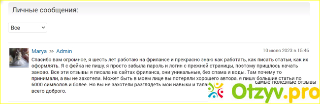 Разумеется, админ мне много чего “прелестного” ответила в личку, дальше с ней пререкаться не стала. Она мне посоветовала, чтобы я пошла работать на другие сайты, где приемлемо писать про все что угодно, где и платят много, и вообще я редиска. И опять мне напомнила о том, что бы я не писала ей с фейка”Что я и сделала, я пришла на свой родной и такой любимый сайт, где я работаю уже многие годы, где и админ – прекрасный человек, и оплата – достойная, и правила написаны для людей нормальным языком – что можно делать, а чего нельзя. И тарифы описаны четко для конкретных статьей, а не так как на сайте saitotziv – хочу плачу по 10 рублей, по 18 рублей или вообще не плачу, а отбраковываю по пустякам статьи.