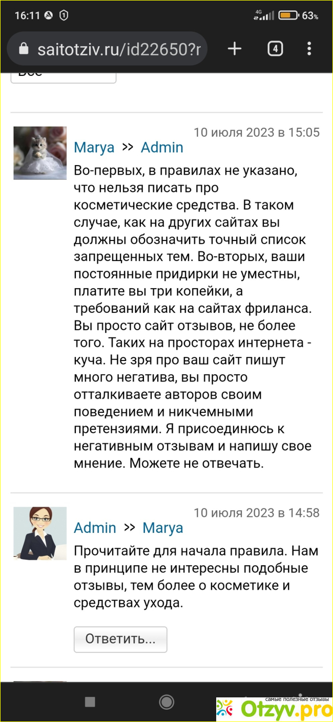 Дальше у нас пошла с ней бурная переписка в личке, я спросила: “Как же я должна была написать статью, ведь я совершила эту покупку, я довольна этим средством, значит и хвалю его? Или я не должна проявлять эмоции и тупо написать отзыв?” На что мне эта дама ответила, чтобы я прочитала правила, что им НЕ интересны такие отзывы, тем более про косметику. Я ответила, что “В правилах НЕ указаны такого рода запреты, в таком случае они как на других сайтах должны обозначить перечень запрещенных тем, чтобы люди знали о чем можно писать, о чем НЕТ! И что ее постоянные придирки неуместны, так как это всего лишь сайт отзывов, а не фриланс, и тому подобное.