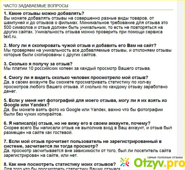 Удобная и понятная навигация, лаконичный дизайн и лояльные правила. Правилами сайт особо не отличается от других отзовиков, а вот на условия стоит обратить внимание. Если автор размещает материал объемом от 500 символов, то он не получает средств за размещение информации, но ему будут поступать средства за просмотры. За просмотр отзыва посетителями сайта начисляется 10 копеек. Если же отзыв более объмный (от 1000 символов), то автор получает фиксированную плату и потом ему будут еще поступать средства за просмотры. Фиксированная плата за размещение отзыва от 1000 символов до 3000 составляет 2 рубля, от 3000 до 5000 символов - 4 рубля, от 5000 и более - 6 рублей. Допускаются отзывы с фотографиями и без. Минимальная сумма для вывода заработанных средств - 50 рублей.